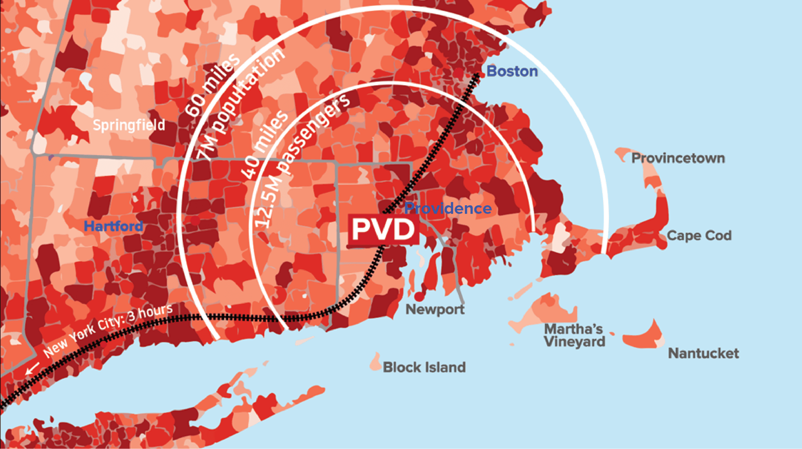 PVD is one of the two airports serving the large and affluent Boston Providence region with the 5th-largest average household income in the United States ($100,929). The zip codes within 40 miles (65km) of PVD generate 12.5 million passenger flights per year. South Boston suburbs are closer to PVD in average drive time than to Logan Airport, thus the 40 mile -radius contains all locations from where PVD is the fastest-to-reach airport.