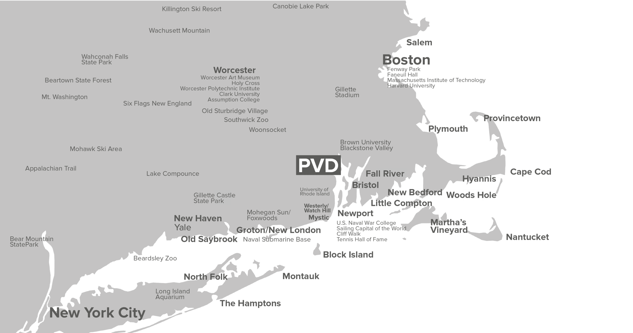 On-site train station, highway and bus routes connect PVD to Providence and downtown Boston. PVD provides easy access to Newport, Westerly and other famous Rhode Island towns and beaches, Block Island, Nantucket, Martha’s Vineyard and Cape Cod.